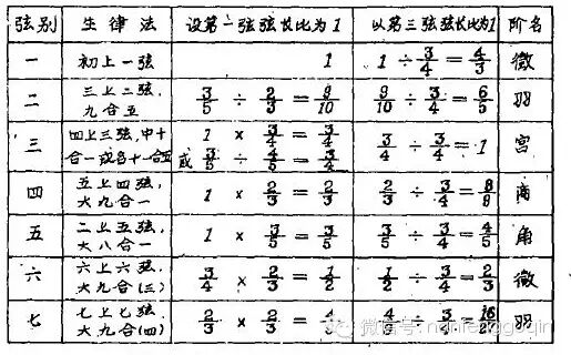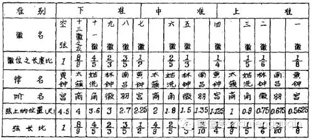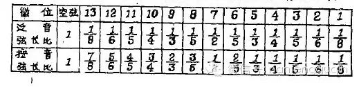 从上表可知, 第六、九徽的按音比同徽泛音低八度, 第十一徽的按音比同徽泛音低两个八度。若以空弦散音为宫(l) , 则第八徽的泛音为角(1/5 ), 而同徽的按音为羽(3/5) ; 第十徽的泛音为宫(l/4),而同徽的按音为清角(3/4),第十二徽泛音为徵(l/6) , 而同徽的按音为散音上方的小三度音(5/6)。